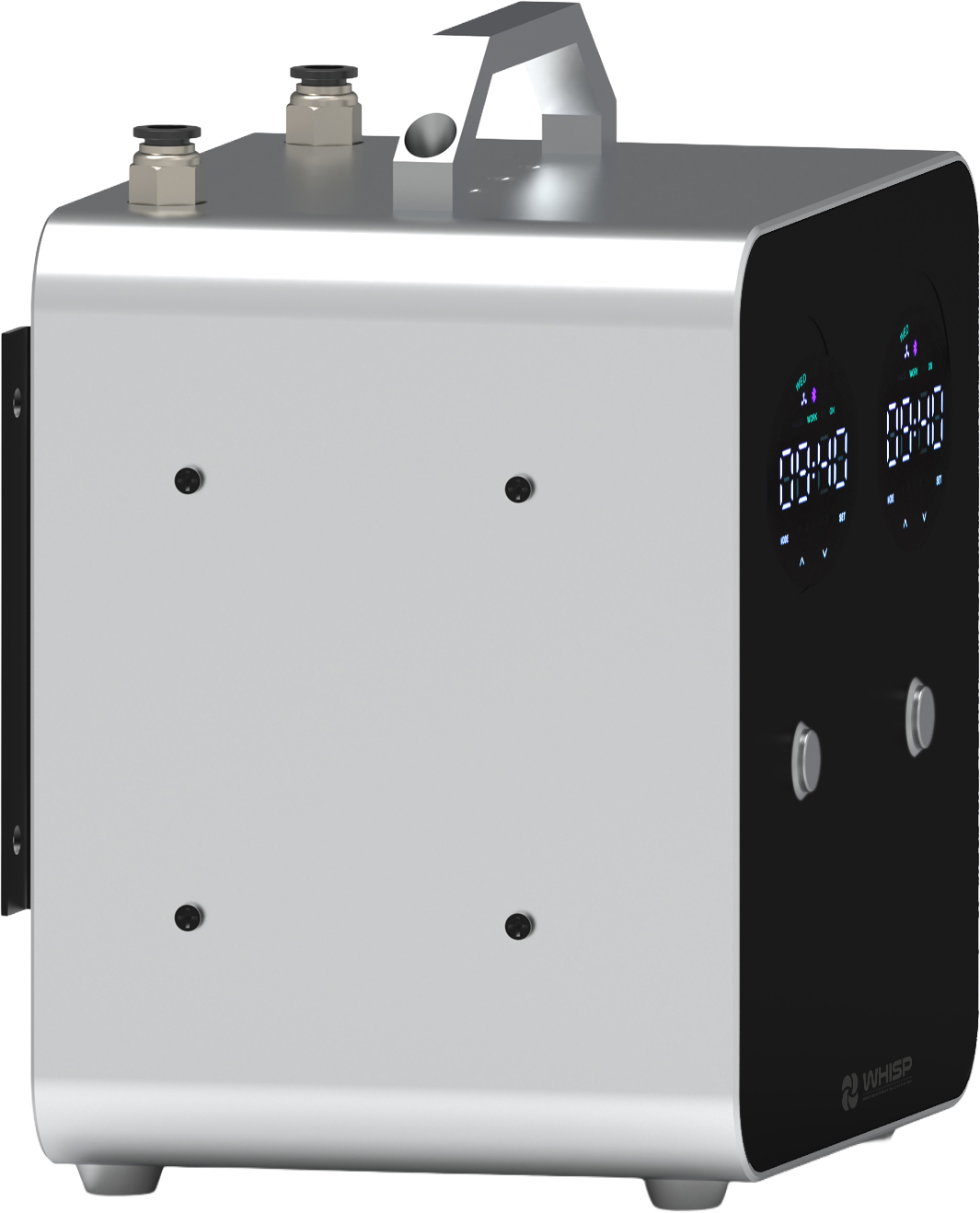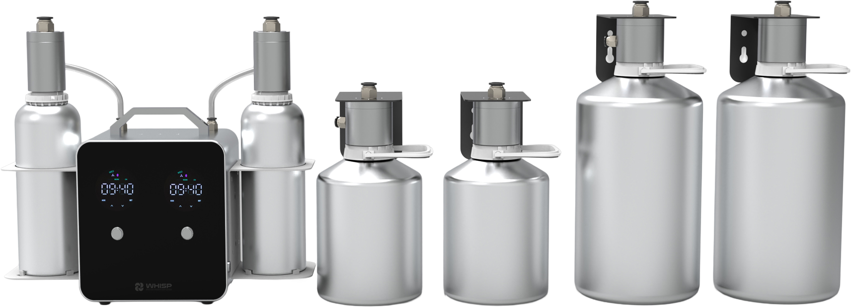 Built specifically for large spaces with 2 atomizers and 2 long-life compressors, and easy refill external dual-canisters, with an option to draw from two 5L buckets.